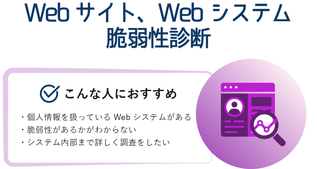 クロスサイトスクリプティングやSQLインジェクションなどWebアプリケーションに潜む脆弱性を診断します。